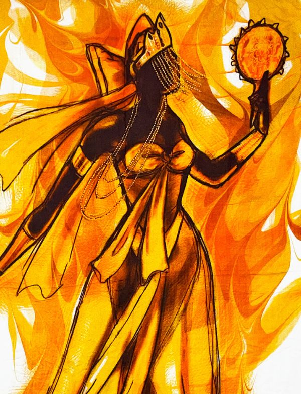 Oxum, the Afro-Brazilian goddess of love, beauty, and fresh waters. Known for her graceful, nurturing, and generous nature, Oxum is a symbol of abundance, fertility, and compassion. The design, with its vibrant colours and flowing patterns, captures her essence and invites you to embrace the energy of love and positivity.