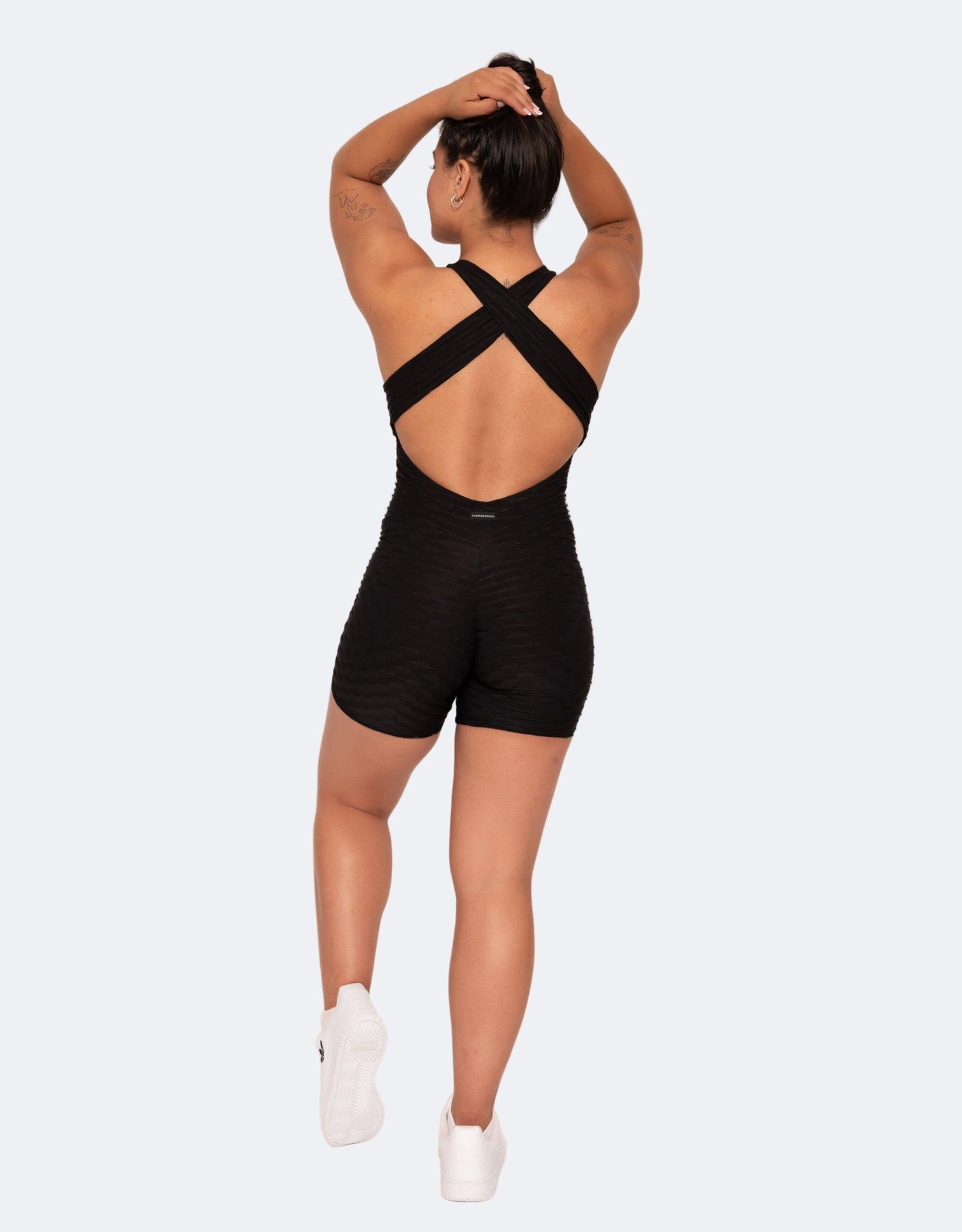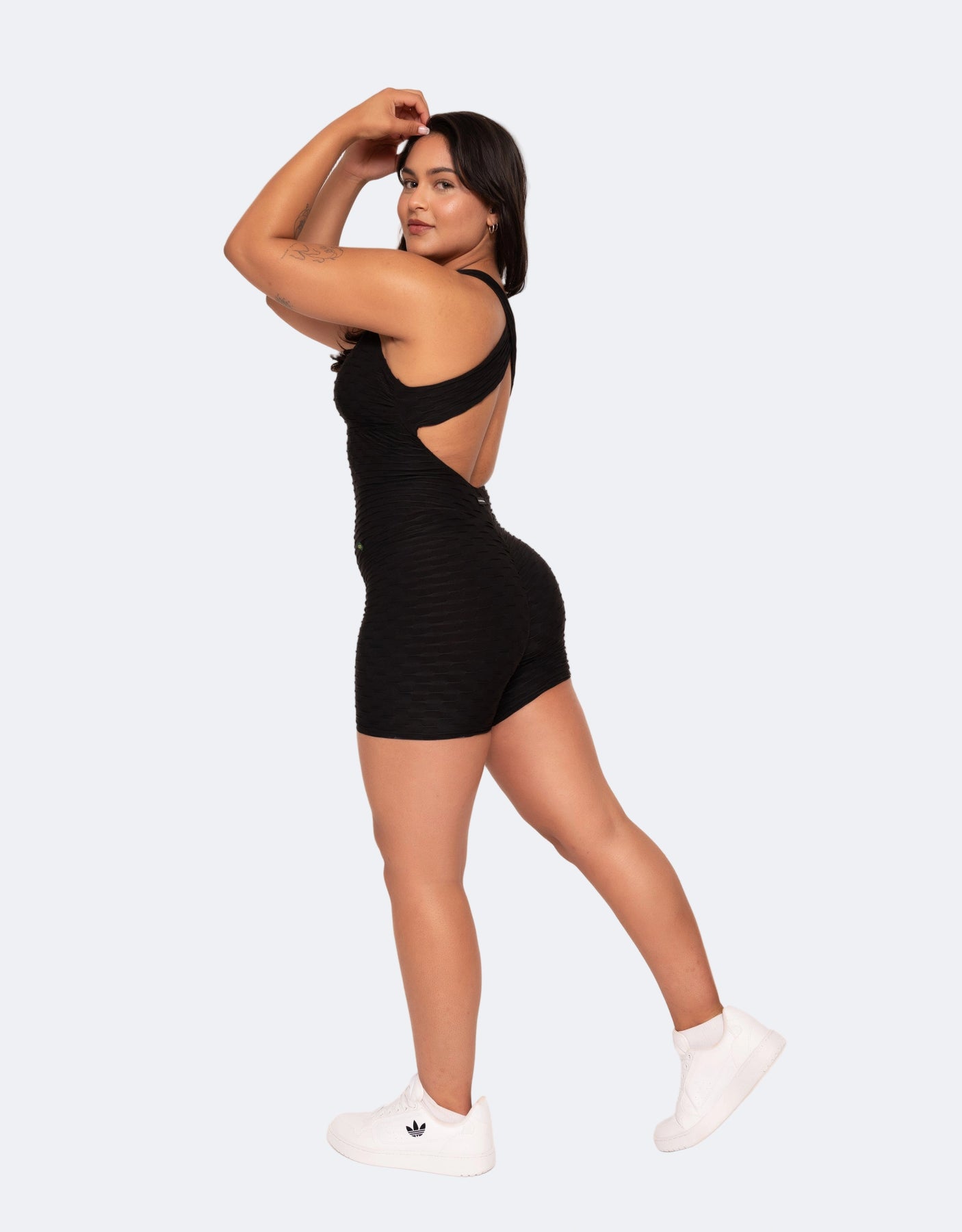 Laila Zero Flaws Black Short Jumpsuit is designed to sculpt, support, and flatter from every angle. Available in two styles — Scrunch Booty for a curve-enhancing lift, or Classic Fit for a sleek, streamlined silhouette — this jumpsuit combines fashion-forward design with performance-driven features, perfect for dance, fitness, or streetwear.